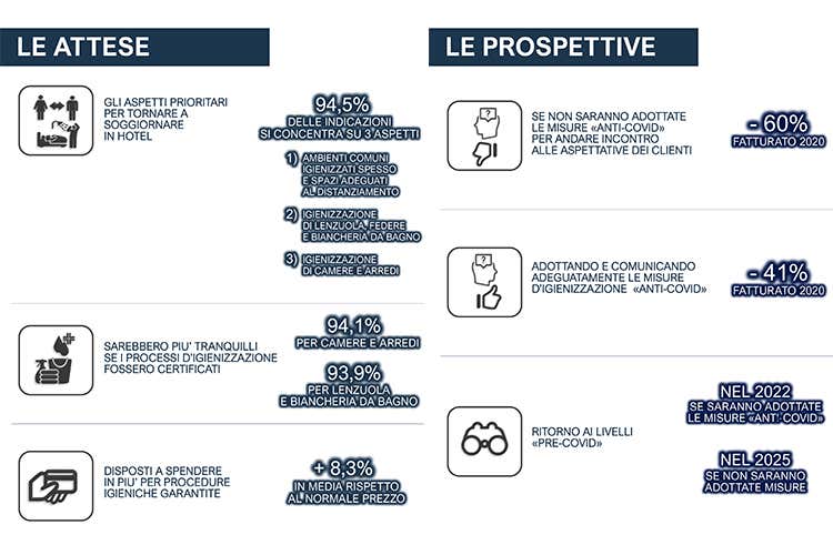Dalla ricerca Tecné è emerso un indice di gradimento dei clienti che ha espresso in media un voto di 7,3. Il 65,9% ha fiducia che gli alberghi adotteranno adeguate misure anti Covid e l’81,5% intende chiedere informazioni in merito. Il 94,5% delle indicazioni si concentra su tre aspetti: ambienti comuni igienizzati spesso e spazi adeguati al distanziamento, igienizzazione di lenzuola, federe e biancheria da bagno e di camere e arredi.