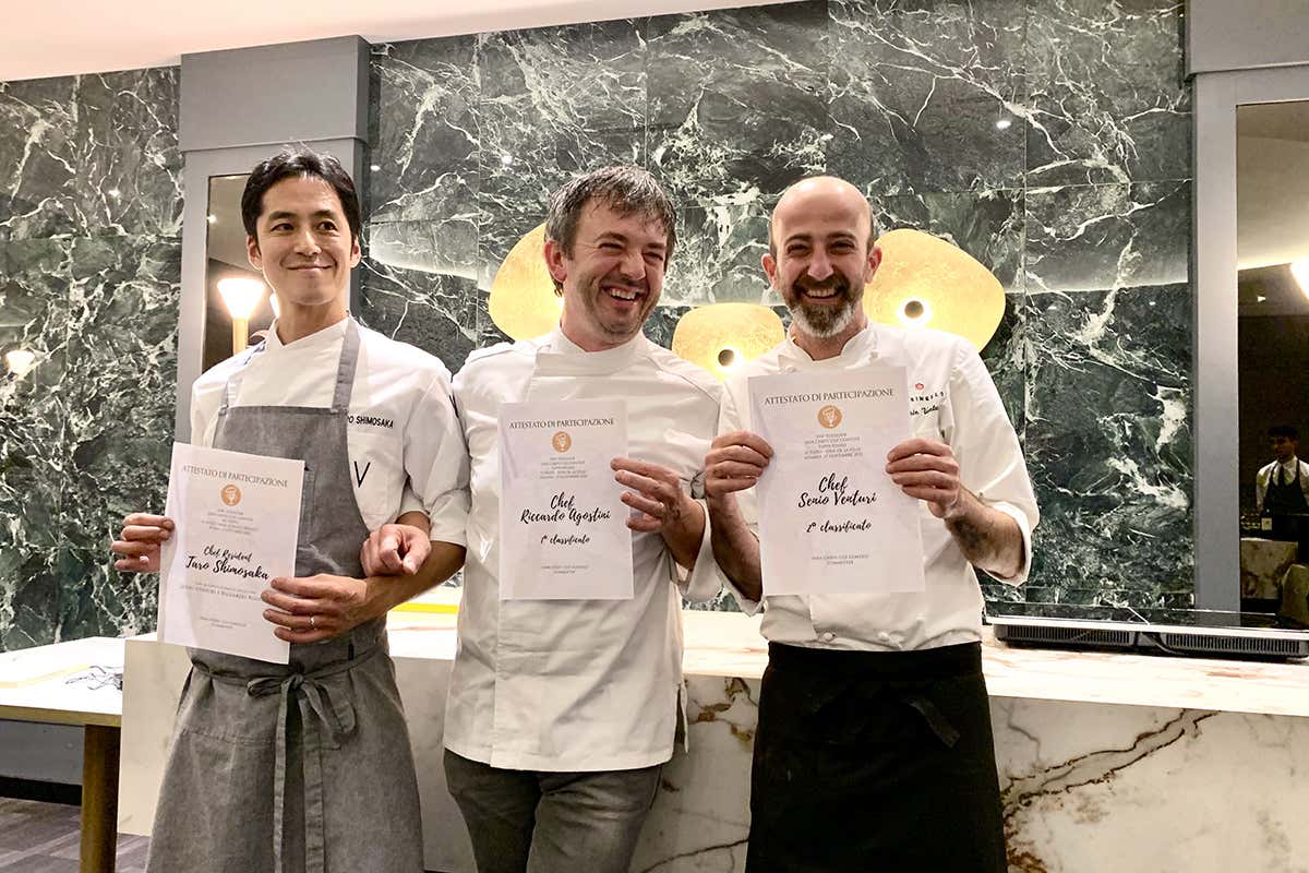Fuori programma, e qui è ritornata la coppia, i due cuochi hanno cucinato in diretta Risotto pecorino di fossa, miele d’edera, spezie, canditi di melone e panpepato. Ha completato il menu lo chef resident Taro Shimosaka con Salmone scozzese, salsa cachi e mizuna, tsukemono di cavolo viola e con il dessert Matcha e frutti di bosco.