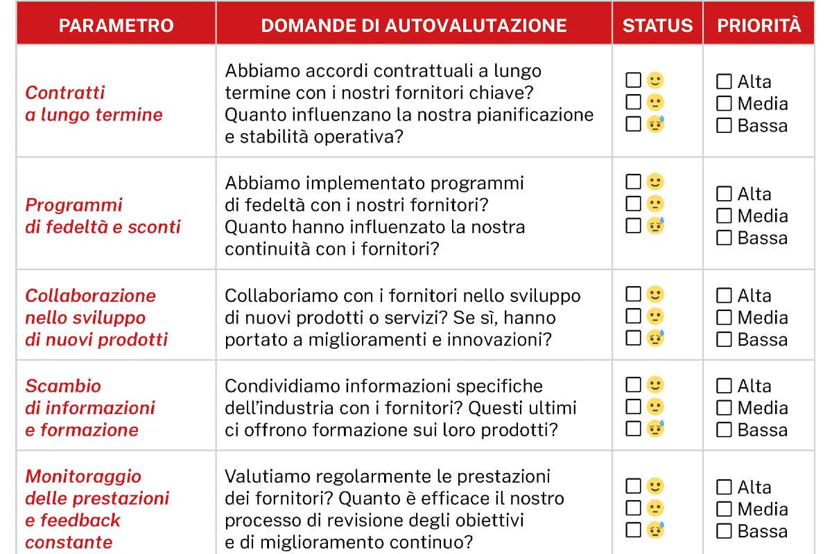 La tabella sottostante (clicca qui per scaricare il pdf) aiuta a schematizzare tutti i concetti e invita a una serena e costruttiva autovalutazione. Per ogni parametro, ci sono un paio di domande che favoriscono una discussione interna o con i collaboratori. Si può assegnare un emoji (sorridente, neutrale o triste) per definire lo status attuale, e poi aggiungere una priorità (alta, media, bassa) così da capire in maniera chiara su quali punti bisogna agire. Si potrebbe incominciare a lavorare sui parametri per i quali l'emoji non sorride e la priorità si dimostra dunque alta.