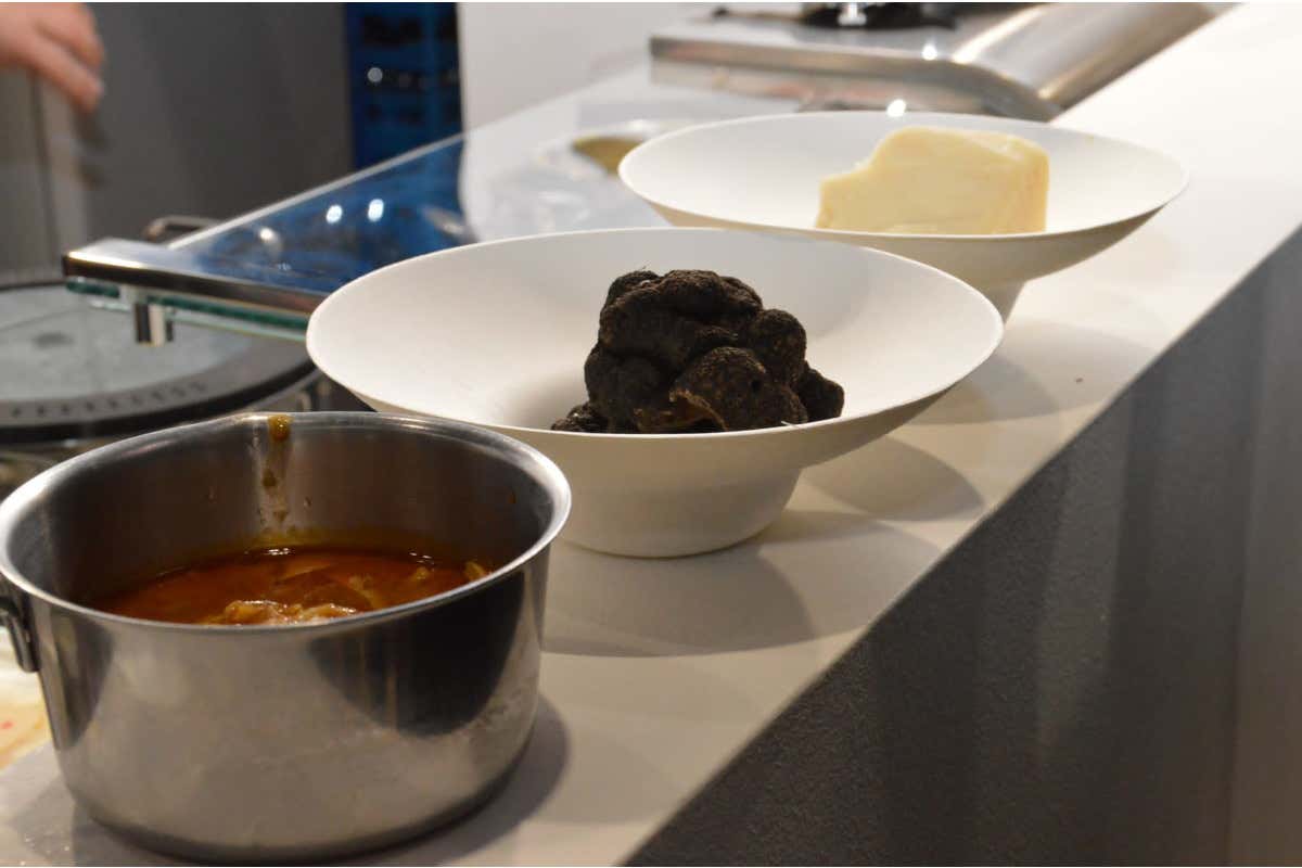 - Stefano Ciotti ha presentato: Trippette di pesce all’anconetana, crema di patate di Sompiano all’arancio e zafferanella, tartufo nero pregiato. Vino in abbinamento: Alcaico Collina delle fate.