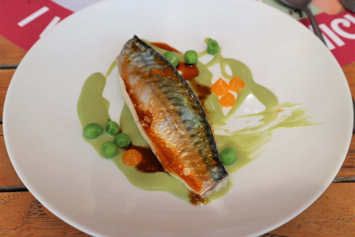 Il menu è stato, quindi, un saggio delle eccellenze gastronomiche liguri e del lavoro di Peq Agri, impegnata a valorizzare i prodotti del territorio e le sue tradizioni gastronomiche. Su tutti, Sgombro e piselli (sgombro confittato alle erbe aromatiche, crema di piselli, piselli sbianchiti, gel di limone rosso, fondo di prosciutto affumicato) e il dessert, Limone e basilico (cremoso al limone e basilico, gel di limone, Pasticcera alla vaniglia, crumble di mandorle).