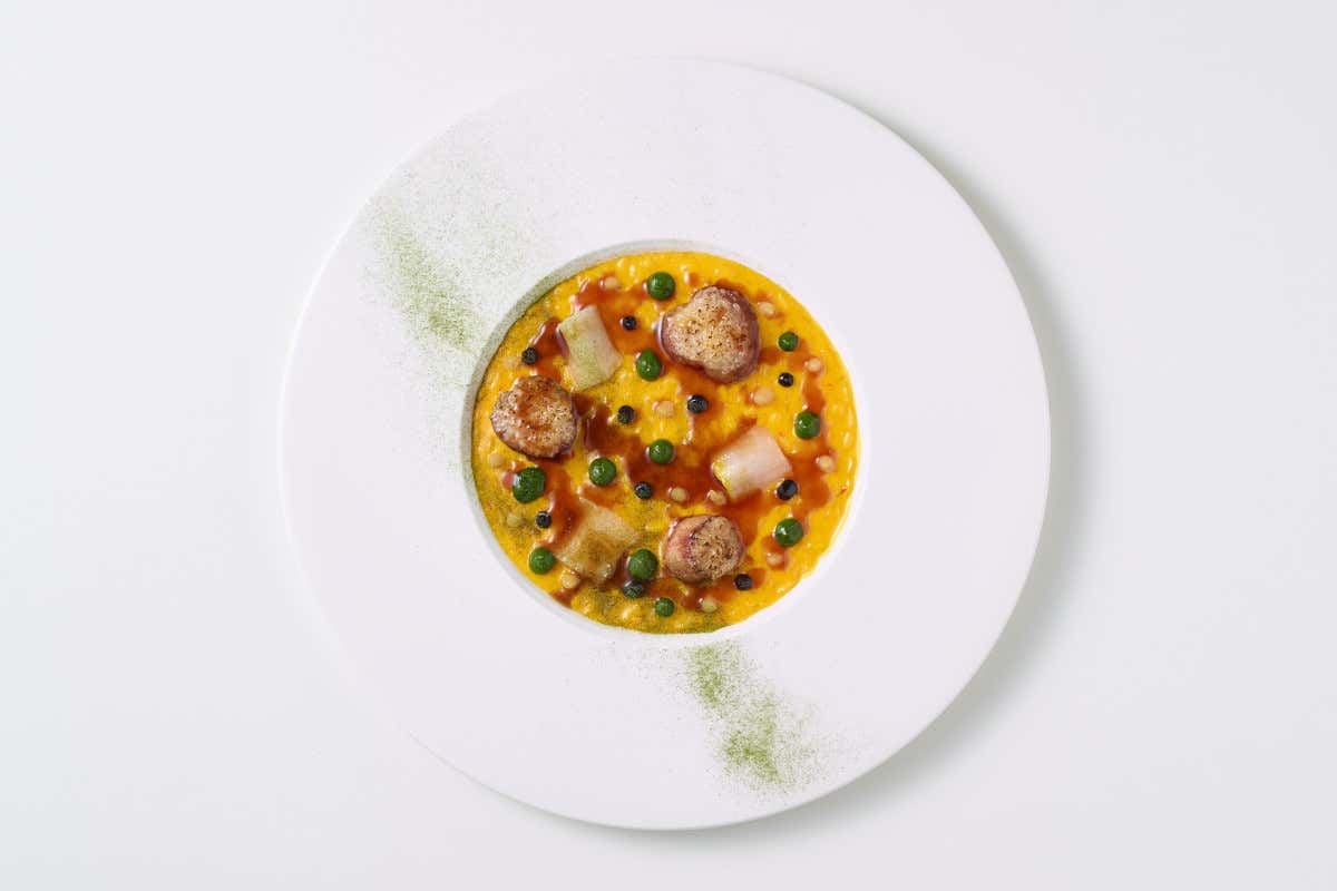 • Primo piatto - “Risotto allo zafferano, midollo gratinato, lardo, gremolada, jus di vitello”: questo risotto è mantecato con burro e Parmigiano Reggiano, arricchito da una riduzione di aceto di vino bianco e cipolle per un tocco di acidità. Il midollo dell’ossobuco, gratinato per croccantezza, viene accompagnato da una gremolada di tre creme – al prezzemolo, all’aglio nero e al limone – per una rivisitazione del classico risotto milanese.