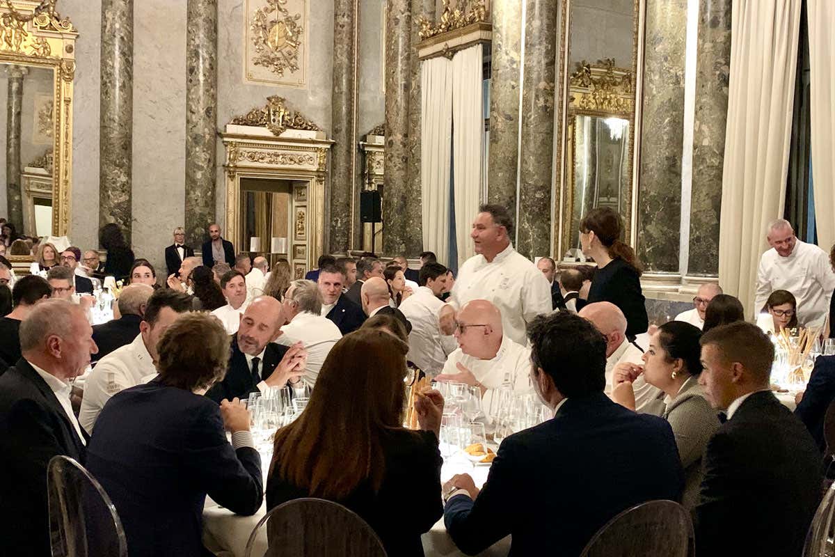 La cena di gala che si è tenuta nei saloni di Palazzo Serbelloni la sera di domenica 6 è stata un omaggio alla prima regione ospite, il Veneto. Coordinata dal maestro Diego Crosara, che ha firmato i fingers al momento dell’aperitivo (Polenta e baccalà, Risi e bisi, Pasta e fagioli, Zucca in saor), ha visto sfilare le stelle Michelin Peter Brunel (Ristorante Peter Brinel, Arco, Trento), Giuliano Baldessari (Ristorante Aqua Crus, Barbarano Vicentino) e Matteo Grandi (Ristorante Matteo Grandi in Basilica, Vicenza). Hanno proposto rispettivamente Ru-Ro insalata russa, rossa, Risotto alla folaga con caffè d’alga e Branzino croccante, acqua iodata, zucca e mandorla. Il gruppo Ampi Giovani del Veneto ha creato il Tiramisù che ha sigillato la serata.