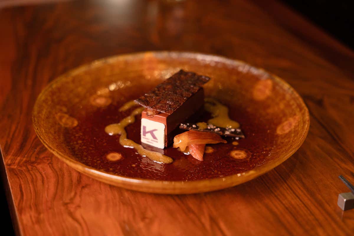 Eppure qualcosa dei grandi ristoratori stellati dev'essergli rimasta nel mestolo, vista la cura maniacale con cui ci ha servito l'apertura della cena, il Cristalbread guarnito di alici marinate, maionese con confit di pomodoro e peperoncino di Aleppo: un parallelepipedo quasi trasparente, un amuse-bouche ricco di ironia e stile Knam, che sapeva di gita soleggiata al mare e scrocchiava sotto i denti con leggerezza divertita.  Superato in potenza gustativa, non estetica, dalla Melanzana piccante con cioccolato Perù 70%, guanciale di maiale iberico e salsa di kumquat al pepe di Sichuan, un piatto completo per il quale si fa fatica a enumerare tutte le sensazioni a corredo, dall'amarognolo al cioccolatoso con intermezzi pungenti e canditi, un trionfo di complessità, una strenna per gourmet, concepibile solo per le occasioni speciali.  E il dessertCioccolato Arancia Fudge Cake” con sciroppo al gin Edelweiss, vaniglia e fava Tonka, mousse al cioccolato Perù Pachiza 70%, Brandy snap, mix di datteri Medjoul, filetti d'arancia e sale di Maldon? Suvvia, lo diamo per acquisito che il Re del cioccolato regna, dobbiamo parlarne?