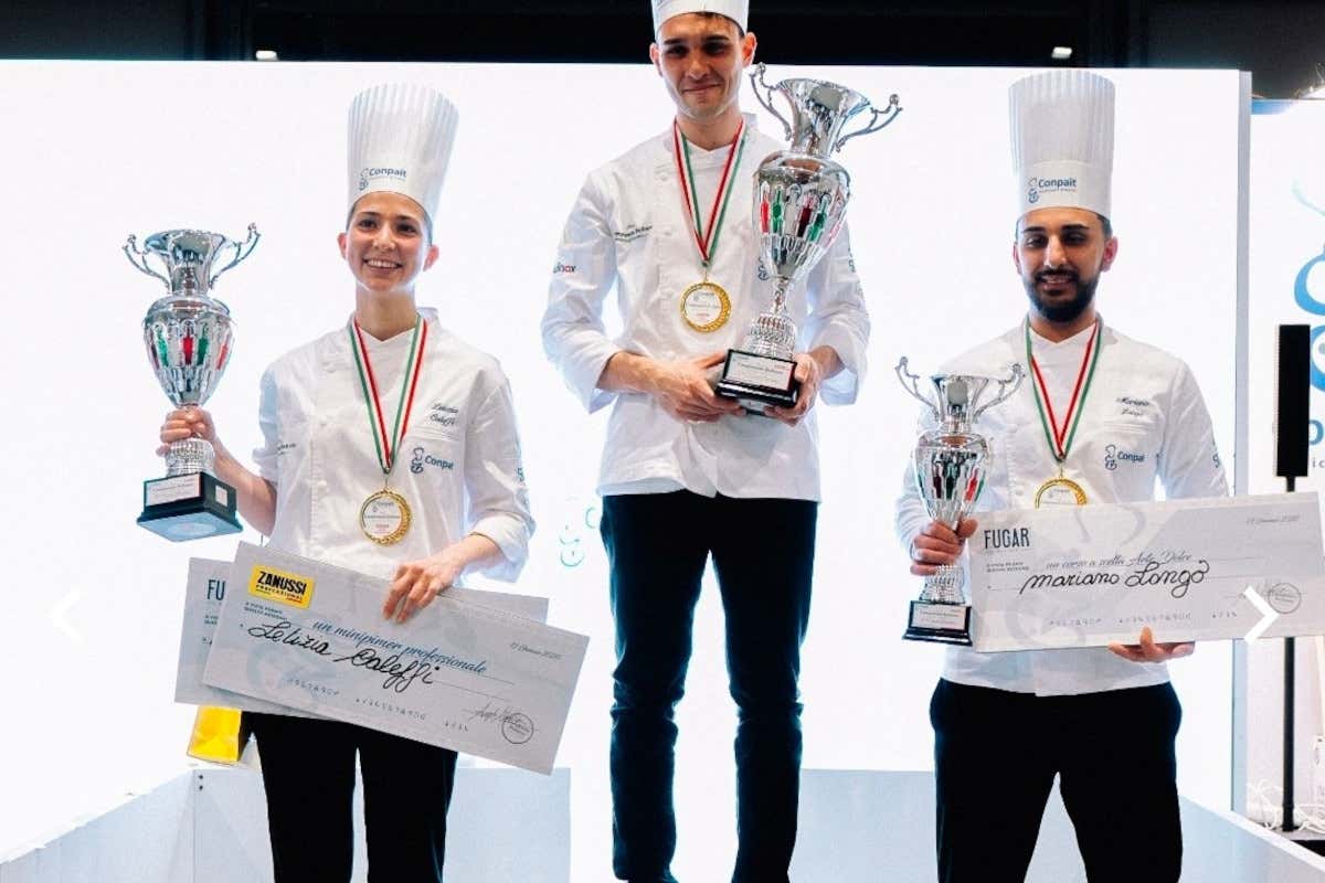 Campionato italiano di pasticceria, il podio: Molinaro al centro tra Caleffi (seconda) e Longo (terzo)