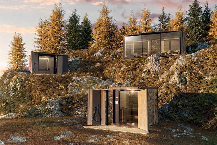 Ambienti wellness disegnati dallo studio Mfor e perfettamente attrezzati all’interno di container industriali, facili da trasportare e installare senza vincoli e ovunque: all’esterno di alberghi, residence e campeggi, ma anche nel giardino di casa, in centro città o nella natura.