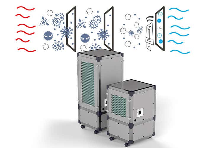 L’azione filtrante si basa invece su una coppia di filtri assoluti Hepa H14, capaci di trattenere la pressoché totalità (99,995 %) del microparticolato e delle goccioline microscopiche prodotte da tosse o starnuti e che agiscono come vettori del virus.