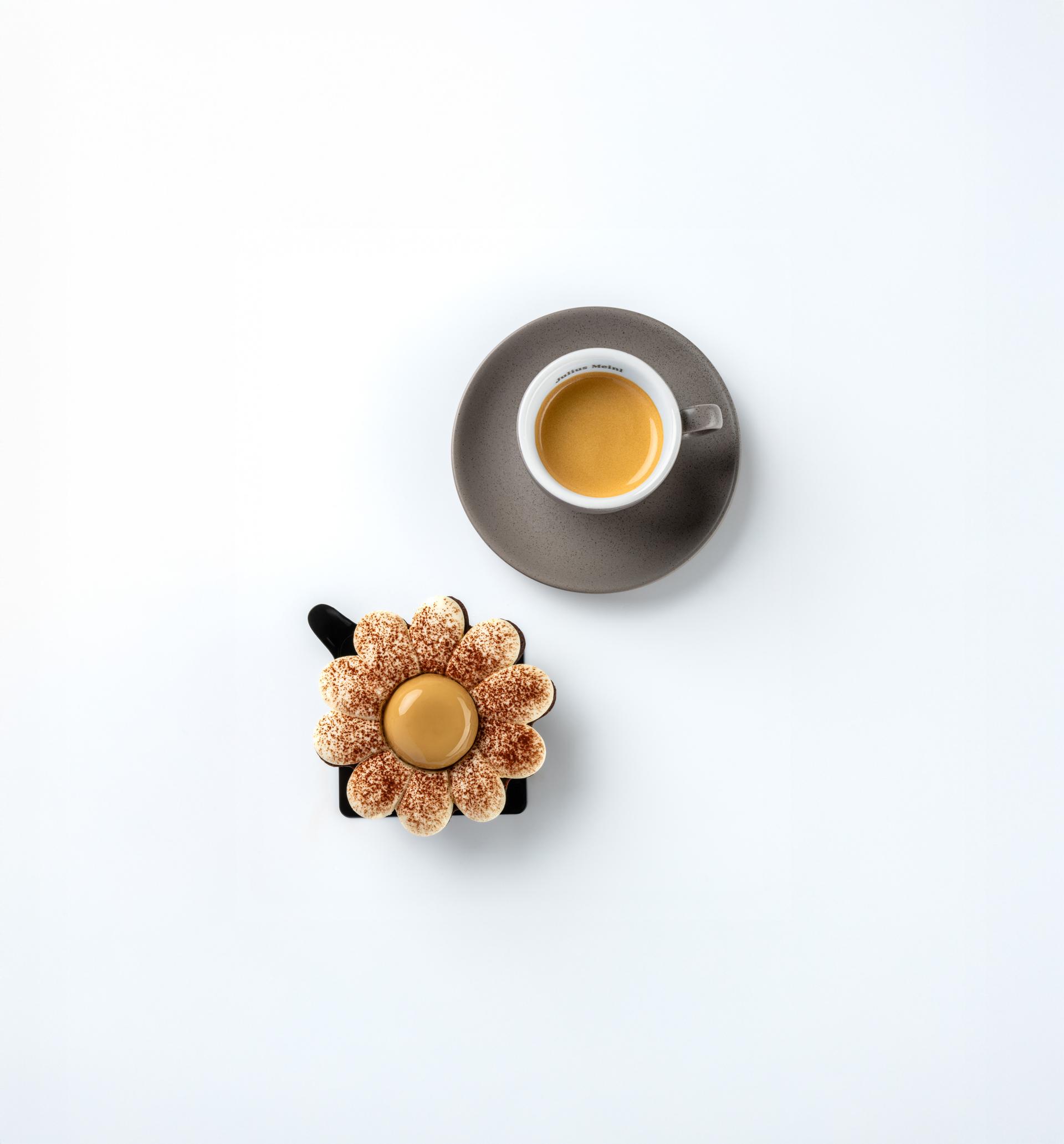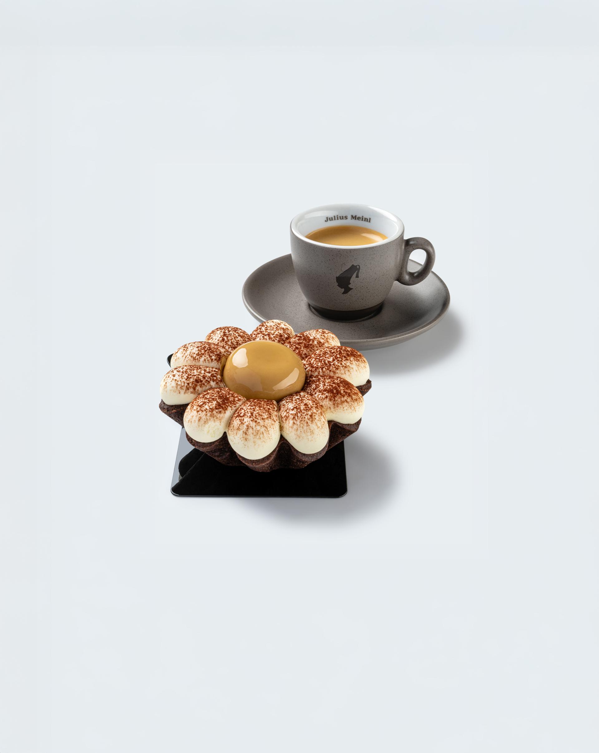 Riempire la crostatina per 1/4 con il financier al cioccolato e cuocere a 170°C per 8 minuti. Lasciare raffreddare. Versare la ganache sopra e conservare in frigorifero fino a quando si sarà rassodata (circa 2 ore). Montare la ganache, distribuirla con una sac-à-poche e decorare con la crema al caffè.