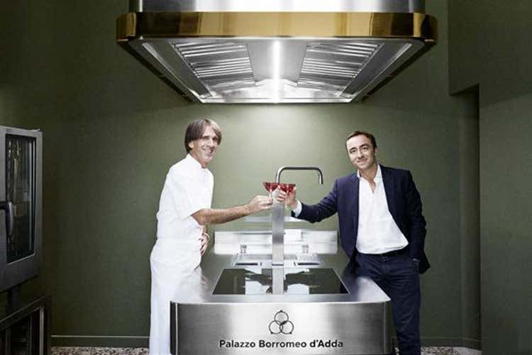 Davide Oldani e Carlo Borromeo uniscono la propria fantasia e intraprendenza per rilanciare Palazzo Borromeo d’Adda, in via Manzoni a Milano. L’idea è quella di dar vita ad un nuovo concetto di ospitalità all’italiana che si snoda tra cene private ed eventi su prenotazione, naturalmente a numero ridotto e nel rispetto delle norme di sicurezza anti-covid. «È la cucina Pop che incontra la storia neoclassica milanese», spiegano i due al Corriere della Sera, immortalati nella nuova cucina del palazzo dall’amico fotografo Giovanni Gastel.