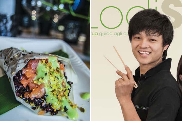 Alex Ye e uno dei suoi temaki con riso rosso, salmone e alga bianca