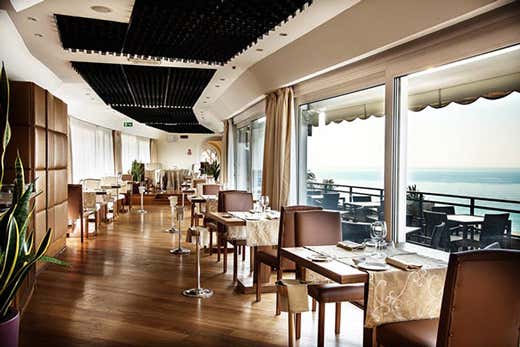 Sono due i punti ristoro del Grand Hotel, ma uno di questi è la punta di diamante dell’intera struttura: il ristorante Le Cupole, della cui eccezionalità, sia per ambiente che per cucina, ho potuto godere dopo aver passato il pomeriggio immerso nell'eleganza e nel calore della cittadina ligure. Saliti all’ultimo piano, già la disposizione del ristorante denota una vantaggio singolare oltre ad una posizione assolutamente invidiabile: un lungo corridoio, sufficientemente largo da ospitare una serie di tavoli in fila uno a seguito dell'altro, inizia e termina con due stanze circolari, le cui pareti in vetro permettono di godere del panorama mozzafiato che dal mare appena sotto si spinge fino a Portofino e via, lungo tutto l’orizzonte della magnifica Riviera Ligure.