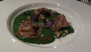 Focaccia di Recco, oggi sostituito dallo stracchino), maggiorana e vellutata al Preboggion, una miscela di erbe aromatiche bollite insieme. Seppur il piatto si presenti semplice, fin da subito il maitre di sala - successivamente, a fine cena, anche lo stesso chef - racconta come realizzarlo abbia necessitato un lavoro lungo e minuzioso per la brigata di cucina, durante il quale svariati tentativi si sono susseguiti per trovare il giusto equilibrio a fondamento di questa ricetta “capovolta”, nella quale «cio che stava dentro ora è fuori, e viceversa». Ogni step della creazione ha presupposto l'assaggio da parte della brigata, asserendo o meno la riuscita combinazione di ingredienti e sapori. Da mangiare in un sol boccone.