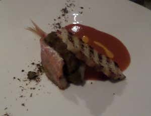 Dopo una breve pausa, durante la quale mi sono preso la libertà di goder della veduta più da vicino, uscendo sul bellissimo balcone, dove i fortunati turisti estivi possono pranzare e cenare respirando la fresca aria di mare, in sala viene servito un pesce che di questo mare è padrone: la Triglia di scoglio, per quest’occasione farcita con capperi e pomodorini secchi, accompagnata da una salsa al “Ciuppin”. Ogni assaggio riesce a trasmettere il sapore autentico delle acque di questa magnifica regione.