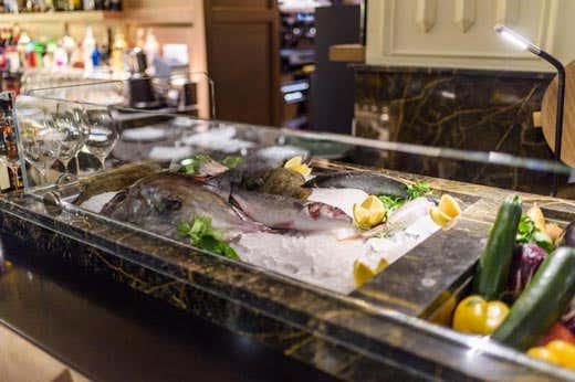 Le sedute di design Costa Group sono personalizzate in pelle e insieme al divano, esaltato dalla parete luminosa, creano un forte effetto coreografico. Le pareti, con rivestimento in marmo, contribuiscono ad attenuare l’impatto acustico grazie alla parte superiore in alcantara verde trapuntata a mano. Il bancone è rivestito in bronzo e suddivido in diverse aree espositive: pasticceria, cocktail e prodotti freschi di giornata su ghiaccio.