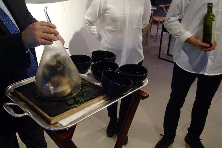 E quando gli facciamo notare che l'ostrica, che rappresenti o meno l'Adriatico, è una scelta osata e coraggiosa perché di grande impatto nel gusto, tanto da stravolgere il senso della minestrina, lui rilancia: «In questo piatto la minestrina è il supporto dell'ostrica, non viceversa. È l'ostrica che deve essere protagonista, altrimenti avrei fatto la minestrina di mia nonna, che è buona, ma non può certo essere servita in un ristorante gourmet».