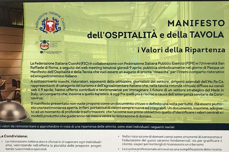 Dopo il web meeting organizzato dalla Federazione Italiana Cuochi (Fic) in collaborazione con Federazione Italiana Pubblici Esercizi (Fipe) e Università San Raffaele di Roma, lo scorso 9 aprile, è nato il Manifesto Orizzontale dell’Ospitalità e della Tavola. Il Manifesto si è sviluppato con il contributo di cuochi, ristoratori, esponenti delle istituzioni, dirigenti aziendali, rappresentanti di categoria e giornalisti e ha come obiettivo fornire linee guida, suggerimenti e indicazioni alla ristorazione italiana post emergenza Covid-19. È uno strumento che rimarrà sempre aperto al contributo delle categorie di settore, nonché di tutta la società civile.