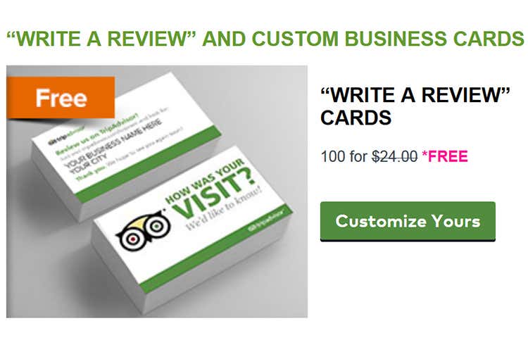 Sembra forse che TripAdvisor abbia fatto dei passi avanti, promuovendosi questa volta “alla luce del sole”: in realtà il ricatto c'è. Il ristoratore che fa a meno di questi gadget, fa a meno delle posizioni sul portale, rinunciando quindi a visibilità e popolarità, che il Gufo, pur di mantenere il primato e screditare ogni possibile forma di concorrenza o protesta, vende gratuitamente! 100 semplici biglietti da visita, infatti, che fino a ieri erano aquistabili per 24 $, ora sono l'unico prodotto (ma anche uno dei più efficaci e diretti) ad essere completamente regalati, a disposizione del ristoratore in forma gratuita.
