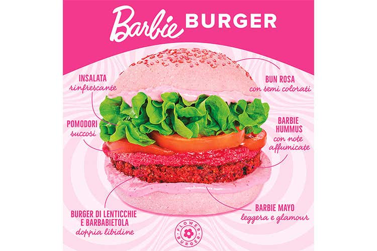 Flower Burger, la prima veganburgeria d’Italia, ha accolto la sfida e ha realizzato un burger vegetale, in esclusiva per Barbie, in cui il colore rosa fa da protagonista: a partire dal pane, realizzato con Farina di tipo 1 italiana, colorato con l’estratto di barbabietola, la quale arricchisce anche il bun con i suoi semi confettati.