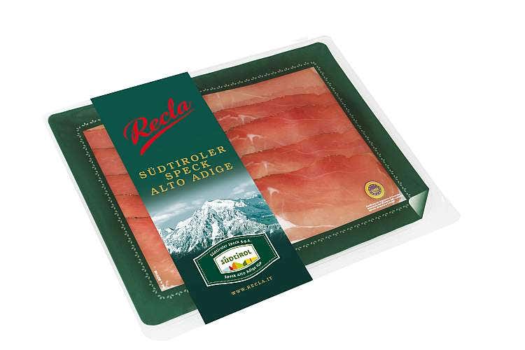 Già affettato in vaschetta, lo Speck Alto Adige IGP di Recla nel formato da 90g è buono e tenero come appena affettato ed è subito pronto per essere gustato, fetta dopo fetta!