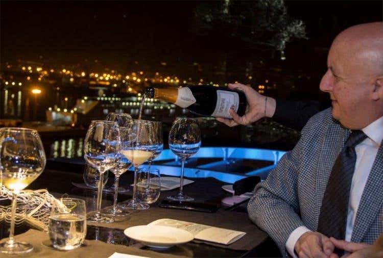 Si sale poi al decimo piano, ampie vetrate a consentire la vista del Golfo di Napoli. Sala molto bella, elegante. Spetta a Salvatore Bianco dare inizio alla successione dei prelibati piatti. E si principia con Scampi abbrustoliti con cetriolo, aloe e cioccolato bianco. La piacevolezza del piatto, che esplode al palato, ha sua gioiosa anteprima già alla vista, con accorti giochi cromatici. A seguire, la famosa creazione di