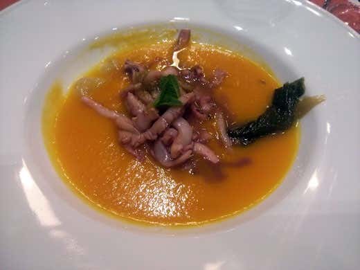 Alfonso CaputoTalvolta letteralmente vivi, guizzanti, i pesci che gli giungono in cucina dalle barche dei pochissimi fidati suoi amici pescatori. Esordio a tavola, graditissimo l’ammiccamento anche al fatto scenico, trancio di palamito cotto su pietra di mare ardente con consistente effluvio aromatico di arancia lubrense speziata. Nel piatto successivo i radiosi colori solari: zuppa di zucca con cipolla caramellata, calamaretti e profumo di menta. Appagamento prima visivo, poi olfattivo e poi gustativo.