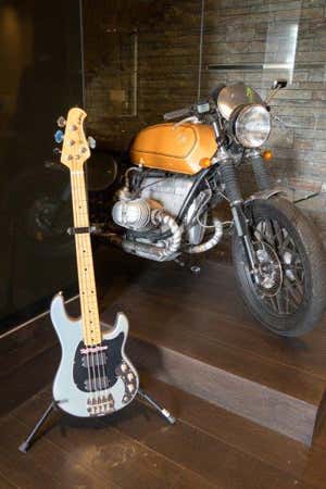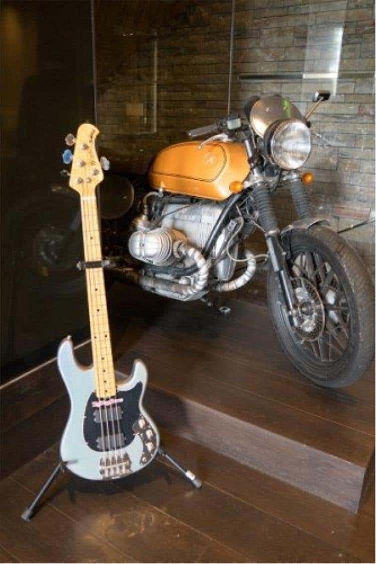 Tornando verso l’ingresso, la scala moderna in vetro ci conduce al piano superiore, ma anche qui un patchwork di kilim antichi e la parete di pietra rendono più caldo l’accesso. Alla base, una motocicletta in bella vista, ancora un pezzo unico assemblato con elementi originali, è una creazione Sumisura di Frank Augello, tributo alla passione per le due ruote che La Mantia condivide con molti amici.