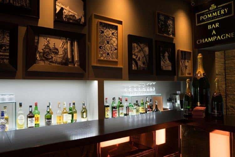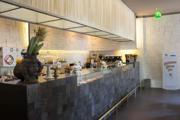 All’ingresso, sulla bella piazza Risorgimento, ci accoglie il bar diurno, luminoso, bianche piastrelle in cotto manuale alle pareti, vetrata affacciata sull’esterno e bancone rivestito in piastrelle di pietra lavica di Made a Mano con decori bianchi che sembrano ricami: aperto dalle 7.30 del mattino con la caffetteria accompagnata da torte, sfogliatelle, brioche, tutto rigorosamente fatto in casa, ma anche da pezzi salati della migliore tradizione siciliana, panelle, crocchette, arancine...