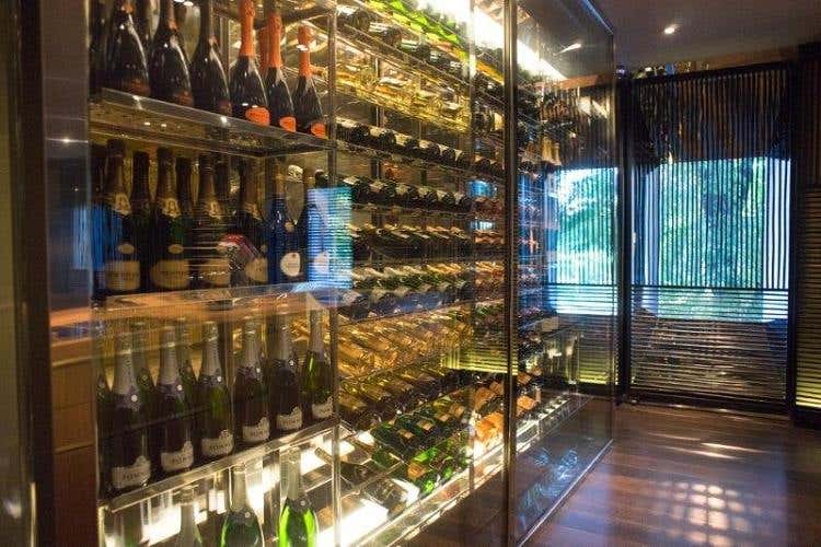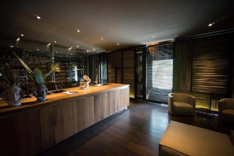 Un’ampia composizione del divano Extrasoft ci accoglie all’insegna del comfort, alla sua sinistra una cucina a isola di Boffi tutta rivestita in legno (con piastre a induzione Fulgor) per lo show cooking. Alle sue spalle una cantina a vista in vetro custodisce le etichette più preziose e contemporaneamente funge da quinta all’ingresso dei bagni. E lo show cooking qui non è solo appannaggio del cuoco-patron, ma anche degli ospiti: chi volesse intrattenersi ai fornelli con amici non dovrà far altro che prenotarsi e troverà la spesa fatta con gli ingredienti pronti per essere cucinati al momento!