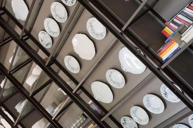 Il lounge prosegue con divani e poltroncine fino a introdurre il ristorante vero e proprio, circa 70 coperti distribuiti fra tavoli di forme e dimensioni diverse, e ancora sedute in paglia viennese si alternano a classiche sedie da bistrot, sedute rivestite in lino e poltroncine Neve di Lissoni per Porro. Lo stesso sistema di librerie a parete ripropone porcellane, ceramiche e vetri in un decoro che qui si contestualizza e fa da cornice alla pasticceria, un cubo di vetro dove il pasticcere crea in diretta. Infine l’ultima parte del locale, con due grandi tavoli rotondi illuminati da altrettanti chandeliers in vetro di Murano, può diventare un privè grazie a un sistema di porte scorrevoli, per garantire privacy a ospiti in cerca di riservatezza.