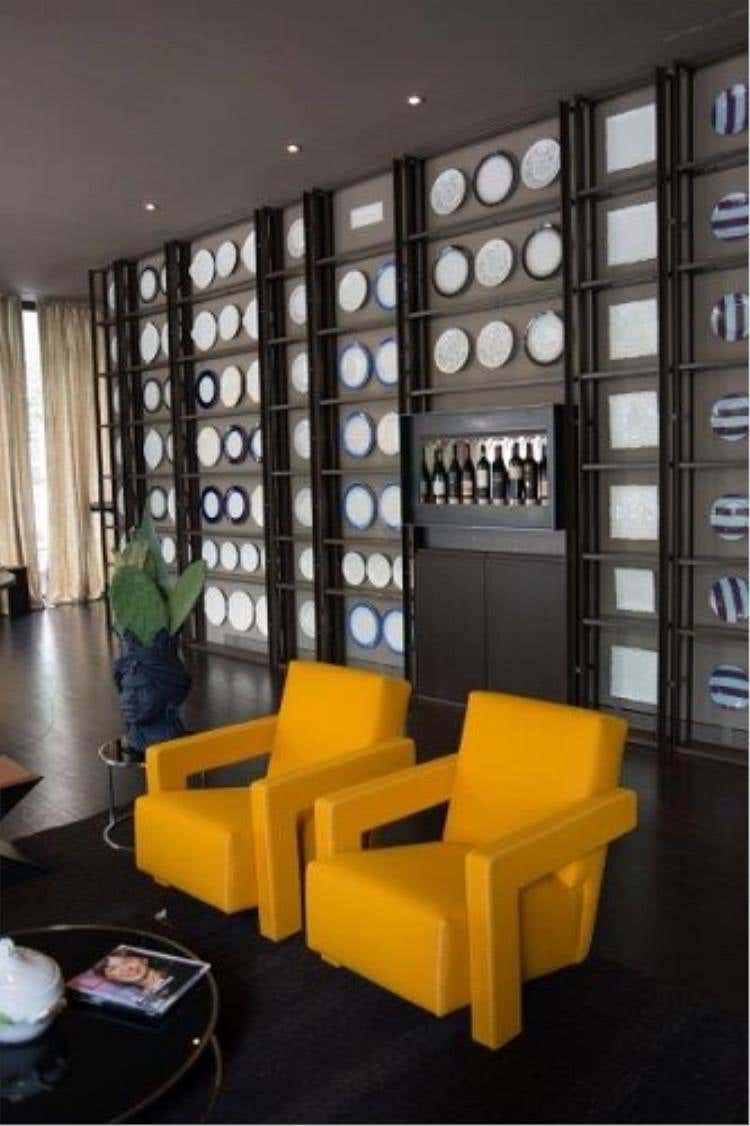 Da qui in poi gli ambienti si susseguono in un’armonia di sfumature dai toni caldi nelle sue declinazioni più sofisticate, dai pavimenti in legno scuro alle pareti color tortora, ma non mancano qua e là tocchi di colore decisi e sapienti. Come nei tavolini bistrot, non solo dai piani di colori diversi ma differenti anche nei materiali e nelle forme, rotondi e quadrati che si alternano. Da qui si accede al grande soggiorno, un’intera parete occupata da libreria che ospita non volumi ma porcellane Richard Ginori e ceramiche di Virginia Casa in bella mostra con alcuni vasi antropomorfi di Caltagirone, creazioni monocrome di Stefania Boemi, rivisitazione moderna della tradizione siciliana.