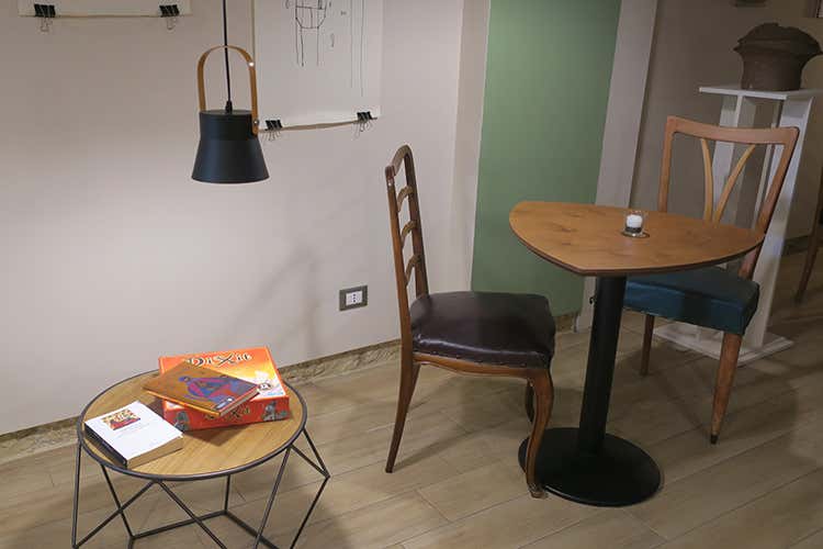 Accogliente come un salotto borghese, è arredato con cura, atmosfera semplice, luci a soffitto calde, poltroncine in legno e stoffa originali anni ’50, biblioteca d’artigianato colorata nel verde d’amour di quegli anni. Alle pareti quadri e foto d’artisti di Milano, Roma, Palermo; sono mostre da non perdere e che si alternano mese per mese.