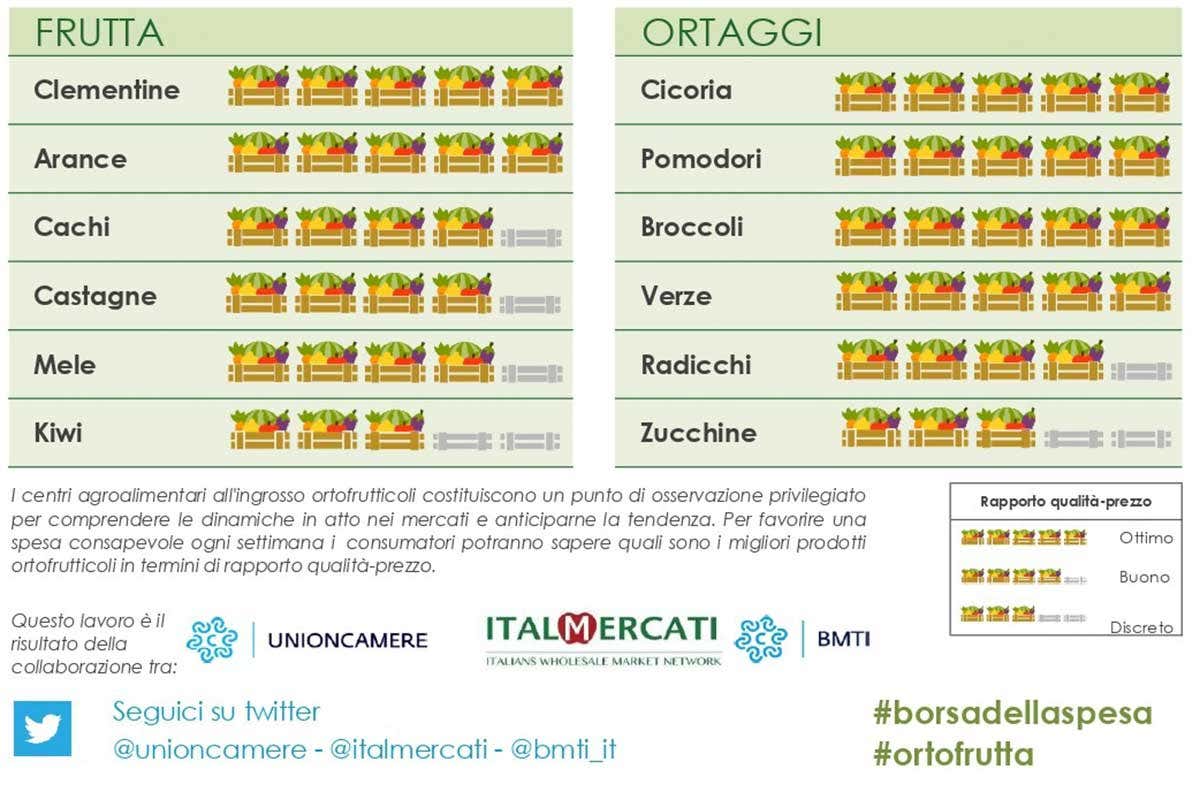 Frutta e ortaggi protagonisti della rilevazione effettuata da Bmti (Borsa merci telematica italiana) relativa alla settimana del 26 novembre. La "Borsa della spesa" è il servizio offerto ai consumatori dalla società del Sistema camerale italiano per la regolazione, lo sviluppo e la trasparenza del mercato e per la diffusione dei prezzi e dell’informazione economica. Obiettivo, favorire un acquisto consapevole.