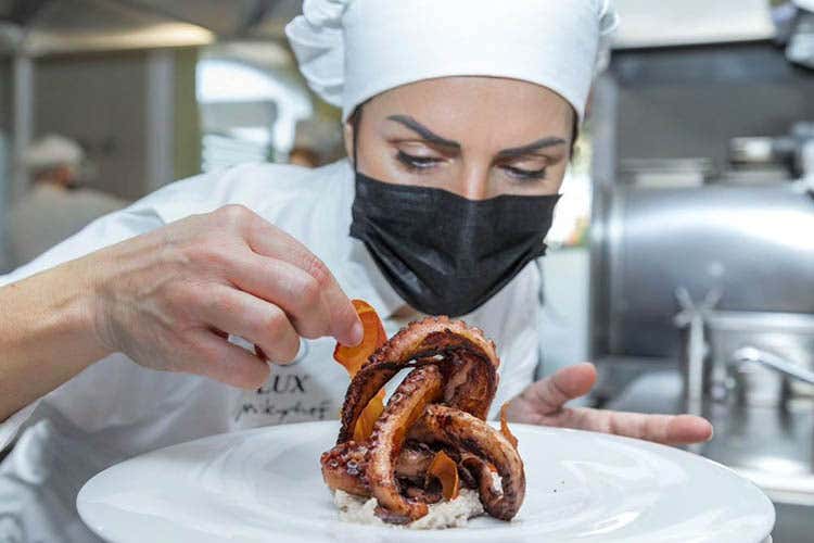 La box da asporto pronta formato picnic (da consumare magari al sole sulle barche ormeggiate nel porticciolo di fronte la banchina o sul terrazzo di casa) prevede: Tartare di tonno con hummus di ceci; Carpaccio di ricciola con trombolotto (un condimento profumato agli agrumi); Rosso di Mazara con burrata. La seconda box disponibile a portar via si termina a casa e contiene un primo, un secondo e un dessert: si parte con il Pacchero Lux (il sugo – pronto per condire la pasta e solo da scaldare - è a base di pescato locale, con sarago, fragolino, marmora e sughero rosa, pomodori confit e timo; la pasta – 110 grammi di quantità – è artigianale in formato mezzo pacchero). Si continua con il Polpo Lux, presentato con una mousse di legumi piccante, pepe di Sarawak e granita di sedano, da riporre in congelatore fino al momento del pasto (il polpo va scaldato in padella per circa quattro minuti, giusto il tempo che si formi la crosticina). Si conclude con il dessert: una Panna cotta con vaniglia Bourbon del Madagascar e culis di frutti rossi allo zenzero.