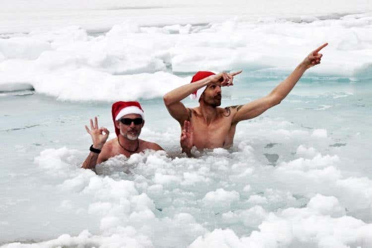 Un gruppo di coraggiosi nuotatori di ghiaccio ha fatto il primo tuffo di tuffo di Capodanno sabato in una delle regioni più fredde della Russia: la città siberiana di Novosibirsk. Una ventina di persone travestite da Babbo Natale, fanciulle di neve e altri personaggi tipici del Natale russo hanno corso per le strade della città e poi si sono tuffati nelle acque ghiacciato di un lago in città. Il termometro esterno segnava era -10 gradi.