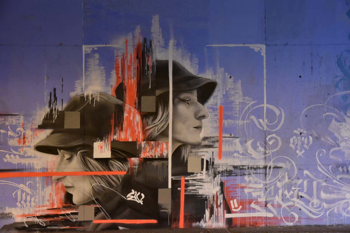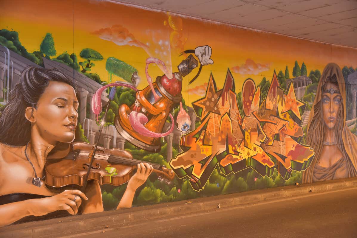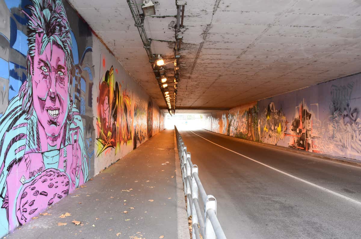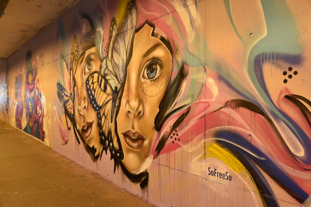 Pedalando tra i vicoli, le strade e i viali di un cuore della Food Valley che rivendica orgogliosamente la propria dimensione artistica, si può immaginare un itinerario espositivo ciclabile che parta ad esempio dal sottopasso tra via Reggio (rotatoria ponte Europa), via Spinelli e via Giulio Cesare, dove nell’ottobre del 2023 nomi provenienti da ogni angolo del mondo hanno lasciato la loro impronta in occasione di “Segni Urbani & Meeting of Styles”, festival internazionale di arte urbana inserito nell’ambito del Verdi Off Festival 2023 del Teatro Regio. Parte di uno dei maggiori eventi di settore a livello globale, nato oltre 20 anni fa a Berlino, la rassegna in veste parmigiana si è concentrata sullo sviluppo del tema “Va Pensiero… Go Thought dal Nabucco di Giuseppe Verdi”, che ha dato vita all’individuale lettura di 46 artisti.
