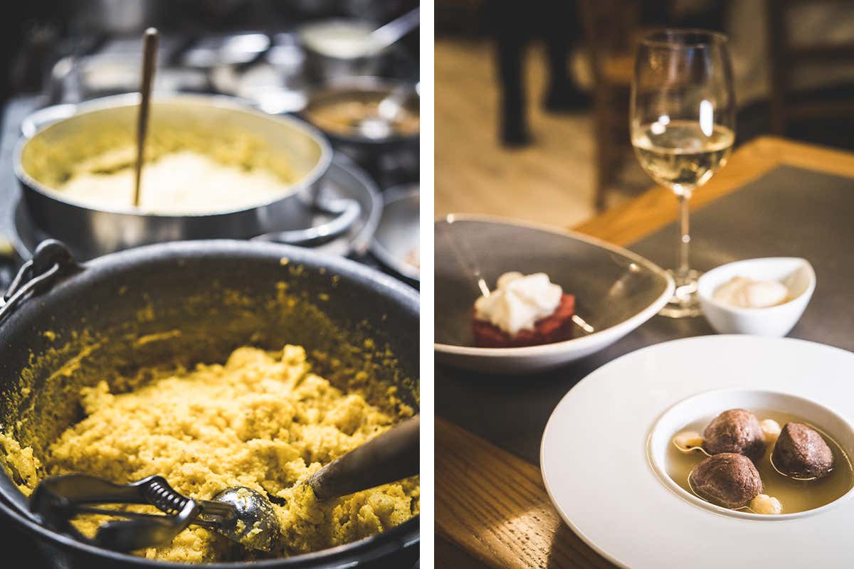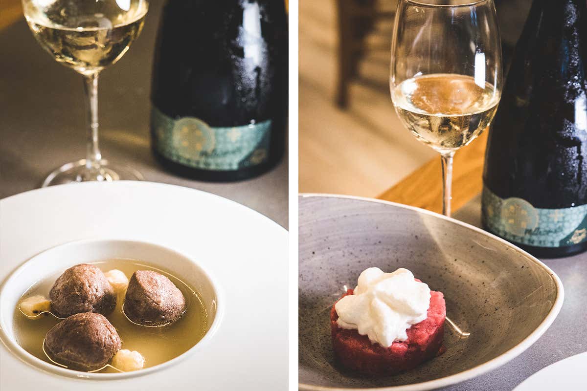 Spazio al vero e proprio antipasto, anzi 3 in uno. Battuta di controfiletto di Chianina con crema di Grana Padano DOP 12 mesi, Polpettine di lesso su brodo di Grana Padano DOP 12 mesi e La polenta di Storo con fonduta di Grana Padano DOP 12 mesi. In abbinamento ritorna la Cantina Bottenago con il "Bottinus" Metodo Classico Garda Doc Spumante Extra Brut, il Colore è fine e delicato. Un giallo paglierino intenso vivace. La bollicina si presenta particolarmente numerosa ed elegante. L’intensità al naso è particolarmente delicata e piacevole, delicati sentori di fiori bianchi, pesca gialla e cedro. Il sorso è fresco ed elegante con note agrumate di cedro e limone che accompagnano una buona sapidità. La persistenza è piacevole nelle sue note saline che ricordano il territorio da cui proviene. L’equilibrio del vino è da sottolineare. Il dosaggio così impostato permette al frutto di portare la sua morbidezza senza eccedere in dolcezza.