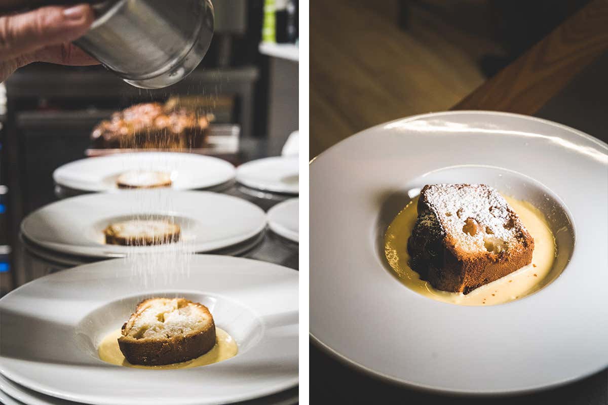 Torta di pere con crema inglese al Grana Padano DOP 12 mesi alla Trattoria Falconi