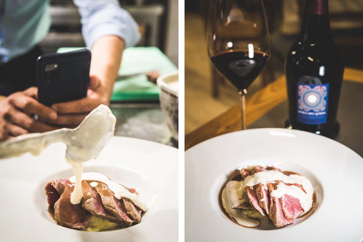 A seguire il secondo, Tagliata di controfiletto di Bruna Alpina con riduzione di Merlot “Leonatus”, purea di gialla di Martinengo e infuso di Grana Padano DOP 24 mesi. Gustoso e rotondo, saporito e invitante. In abbinamento lo stesso vino usato per la riduzione, il Garda Dop Merlot “Leonatus” dell'azienda Perla del Garda, rosso tra il rubino e porpora. Al naso non ci sono note sovra mature, cotte, ma tutt’altro. Una parte ancora fresca ed erbacea, un frutto croccante, una spezia in parte pungente, sintomo di gioventù. La liquirizia è in bastoncino e non in polvere altro sintomo di un vino in tensione e non seduto. Il sorso è verticale, muscoloso, strutturato e vigoroso. Allo stesso tempo abbiamo una grande bevibilità e una golosità non indifferente. Un vino con davanti a sé tanti anni.