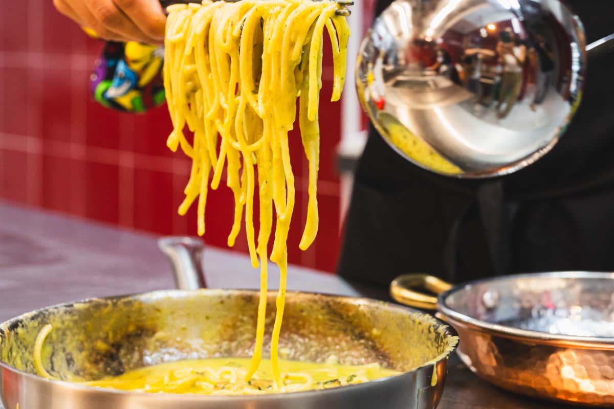 Rigatoni alla carbonara veg con crema di carote e anacardi, seitan marinato, gondino veg al pepe Foto: Simona Bruno