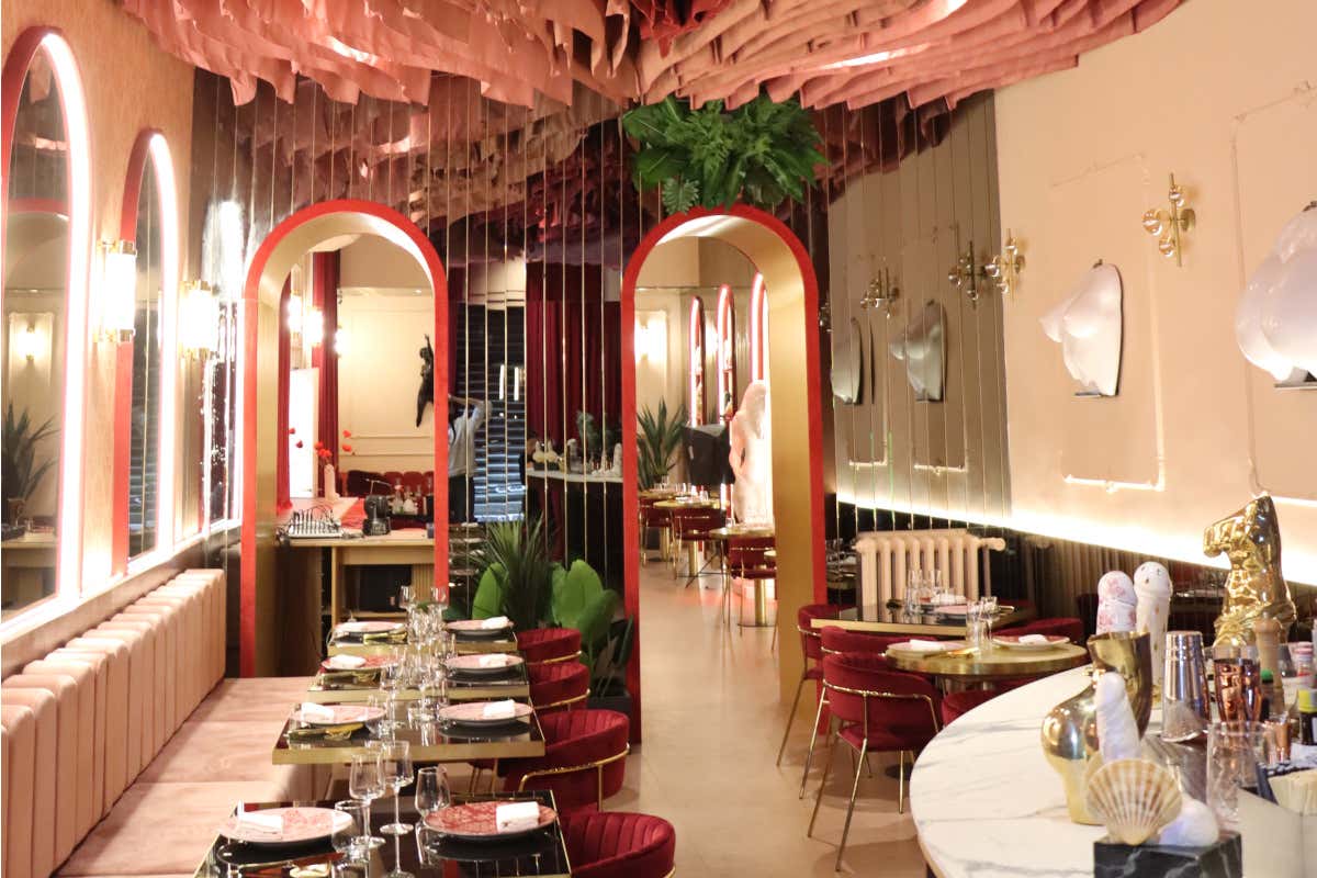 Il locale presenta una fusione di elementi lussuosi e suggestivi, con una combinazione di ottone, velluto rosso e rosa, marmo bianco e specchi a listelli. L’illuminazione dai toni caldi crea un’atmosfera intima e rilassante, avvolgendo gli ospiti in un abbraccio accogliente; la carta da parati, raffigurante un disegno erotico, aggiunge a Voglia un tocco misterioso e affascinante.