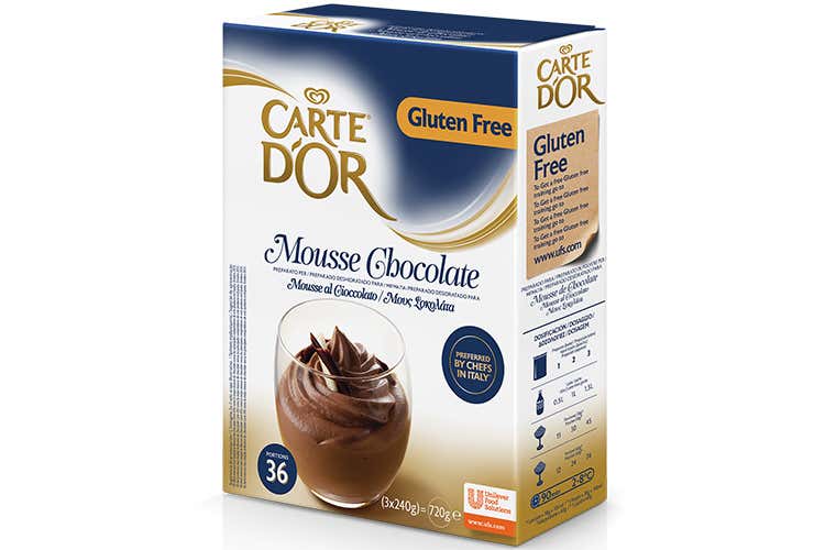 Carte d’Or Mousse al CioccolatoLa nuova ricetta Carte d’Or Mousse al Cioccolato è certificata senza glutine. La migliore ricetta Unilever Food Solutions di sempre, con il 62% di cioccolato in polvere. La confezione di Carte d’Or Mousse al Cioccolato contiene 3 buste per un totale di 36 porzioni. La preparazione è facile e veloce. Basta versare in un recipiente il contenuto della busta e 0,5 litri di latte freddo. Si monta con una frusta elettrica per 3 minuti circa a media velocità. Prima di servire, riporre in frigorifero per almeno 90 minuti. Carte d’Or Mousse al Cioccolato fa parte della gamma di preparati per Dessert Carte d’Or senza glutine, che include anche Panna Cotta, Crema Catalana, Sorbetto al Limone e Tiramisù nuova ricetta con Mascarpone. Prodotti estremamente pratici, affidabili e versatili. Si preparano in modo semplice e veloce e garantiscono qualità elevata anche in assenza di personale specializzato.