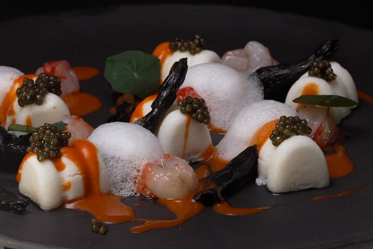 Gnocchi di cavolfiore, gamberi rossi, funghi trombetta, caviale, aria di aglio