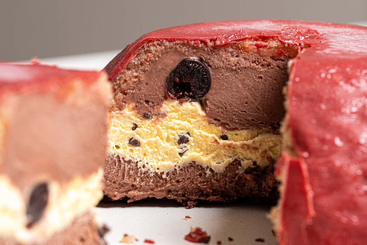 Spumotto del maestro Benito Odorino: un'evoluzione del dolce tradizionale, con pan di spagna bagnato all'alchermes, gelato al cioccolato fondente 68%, amarene semicandite, gelato spumoso alla crema, base croccante al cioccolato e fior di sale, il tutto glassato con cioccolato Ruby. Un connubio di sapori e consistenze per un gusto irresistibile.