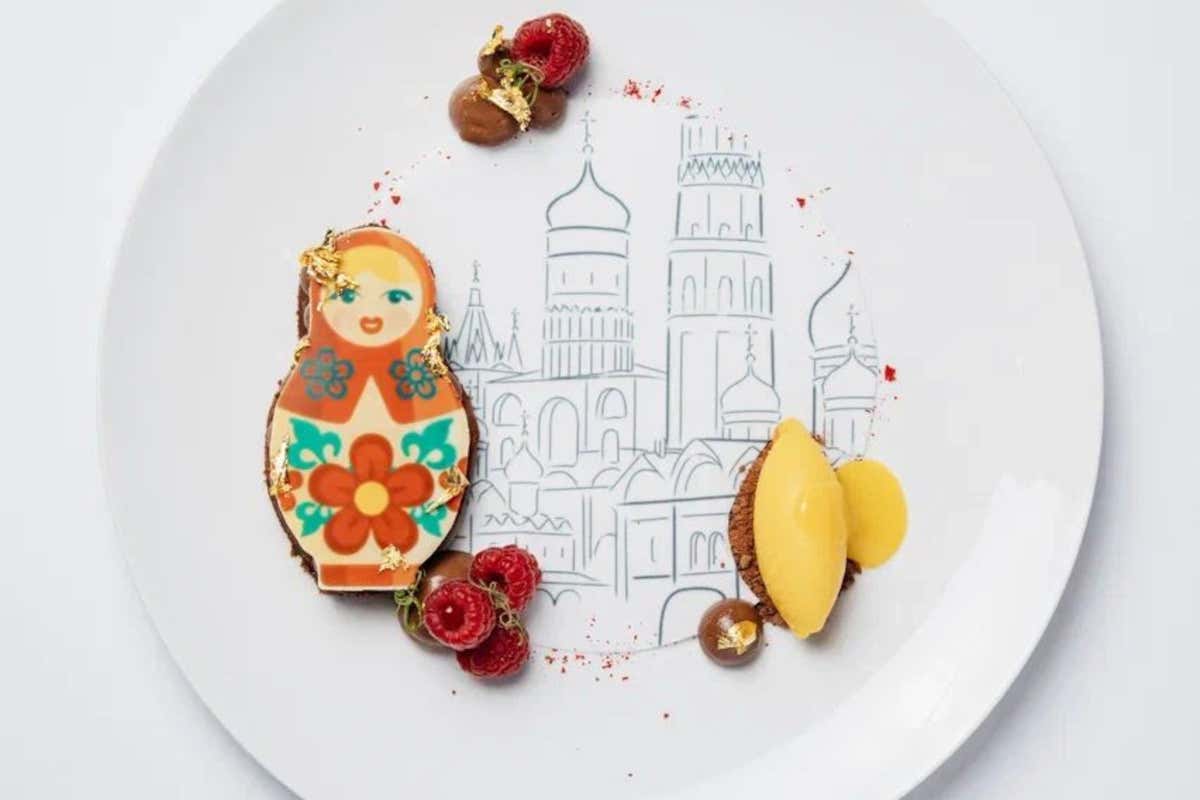 Matrioska del maestro Carmine Di Donna: un dessert che evoca la tradizione russa, con un pan di Spagna al cioccolato 62%, confit di mango, cremoso al cioccolato al 62% e un sorbetto al mango. Un gioco di contrasti tra consistenze e temperature per un'esperienza gustativa unica.