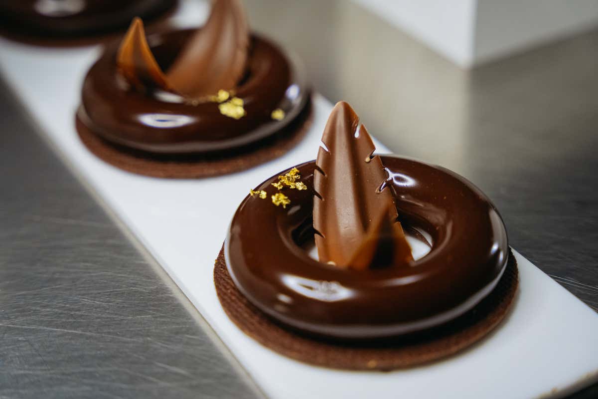Cioccolato caffè e fava tonka del maestro Cesare Murzilli: un dessert che celebra l'equilibrio tra forma e sostanza. La mousse al cioccolato fondente Caraibe 66 e il cremoso al cioccolato al latte jivara e fava tonka si abbinano a una salsa al caffè e fiori d'arancio, creando un'armonia di sapori unica.