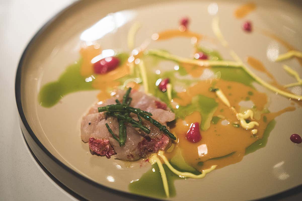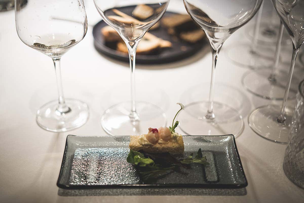 Ma andiamo con ordine, cena di 4 portate ad ognuna abbinato un vino, gli ospiti sono stati guidati nella degustazione dal sommelier Federico Bovarini. Si parte dall’amouse bouche, abbinato al Gralò Franciacorta Docg extra brut, bolla fine, colore paglierino brillante, al naso è fresco con note di erba aromatica (mentuccia e rosmarino), sentori di crosta di pane. In bocca è fresco e leggermente sapido. Equilibrato e con una persistenza molto delicata. Si prosegue con il Carpaccio di triglia marinato al gin, pepe rosa e zenzero che ben si sposa con il Colletto “Il 99” blanc de blancs millesimato, Chardonnay in purezza, 90 mesi sui lieviti dal colore dorato brillante. Al naso un'esplosione di crosta di pane con note leggere di nocciola tostata e mandorla. Arriva poi pepe bianco e cedro candito. Molto complesso ma fresco. In bocca riporta le stesse sensazioni olfattive a cui si aggiungono un’estrema pulizia e freschezza supportate da una grande acidità. Diretto ed esplosivo.