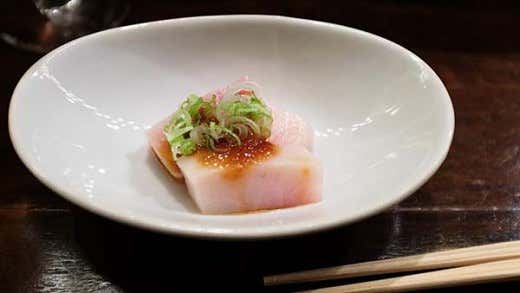Preparazione: Pelare e tagliare la cipolla a fettine. Aggiungere il miele e 3 cucchiai di aceto di riso. Far decomporre e passare al frullatore a immersione. Unire il tabasco. Marinare lo spada con la ponzu all'arancia, ovvero spremere l'arancia fresca ed estrarne il succo. Unire la soia e il sakè. Infine l'aceto di riso. Emulsionare. Speziare lo spada con il pepe macinato finissimo e tostato in padella per accenderne il gusto. Marinare solo per pochi minuti. Tagliare a cubetti. Guarnire con la salsina d'arancia e il porro crudo all'aceto di riso.