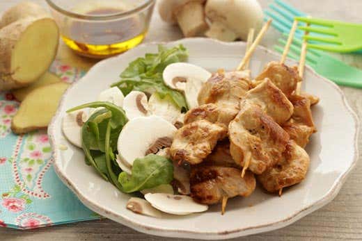Preparazione: tagliate la carne a fettine abbastanza sottili e ricavate poi delle strisce. Preparate una marinatura a base di zenzero grattugiato, un cucchiaino di salsa di soia, il succo di mezzo lime, un cucchiaio di olio extravergine di oliva e immergete la carne lasciandola a marinare in frigorifero almeno una mezz'oretta. Trascorso questo tempo, infilate ogni striscia di carne in uno spiedino, scaldate bene una piastra di ghisa e appena sarà calda adagiate gli spiedini di carne spennellando con la marinatura rimasta. Cuocete solo 5/6 minuti per parte. Nel frattempo preparate una citronette con il succo di lime rimasto, un po' di zenzero, un cucchiaino di soia e servite come accompagnamento alla carne e all'insalata di funghi.