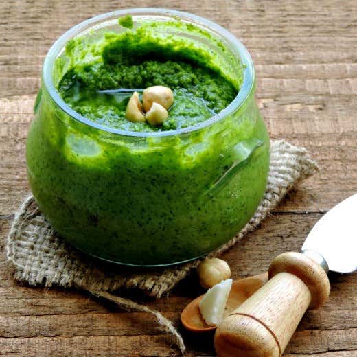 (per 400 g di pesto): 100 g di rucola; 150 g di olio extravergine d’oliva; 50 g di pecorino romano; 50 g di nocciole tostate; 1 spicchio d’aglio; 2 g di sale.