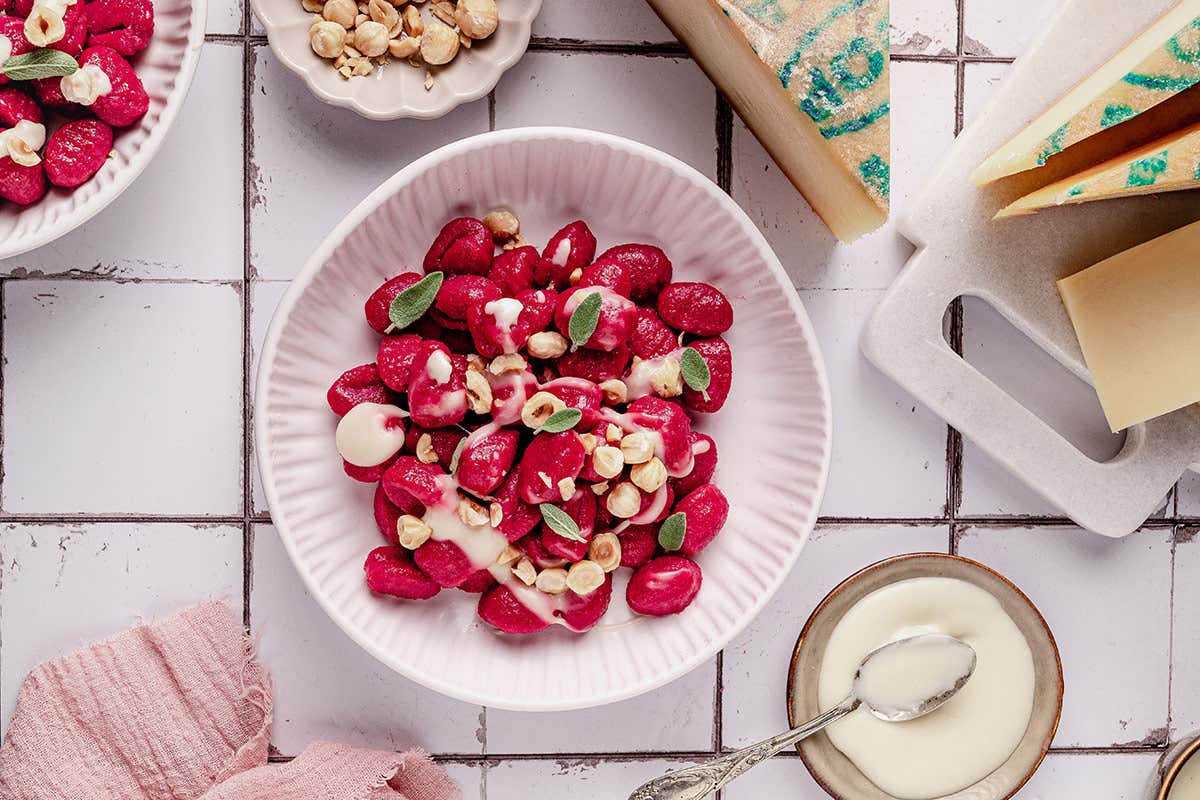 Gnocchi di barbabietola con fonduta e nocciole tostate